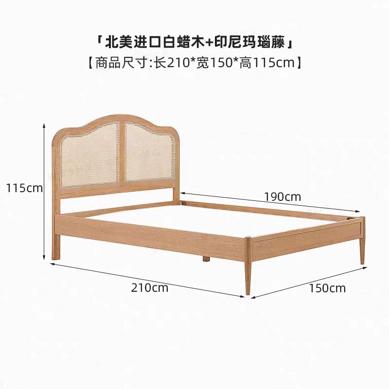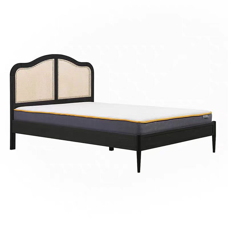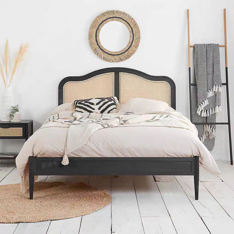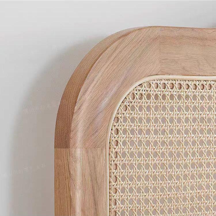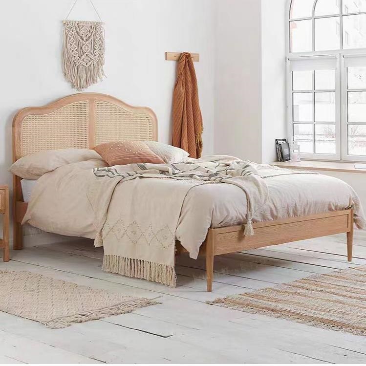 En el corazón del atractivo de esta cama se encuentra su elección de materiales premium. Opta por el roble rojo robusto y elegante, el roble blanco ligero y versátil de América del Norte, o las cenizas blancas cálidas y acogedoras. Cada tipo de madera trae su grano y textura únicos, agregando un toque de belleza de la naturaleza a su habitación. El cabecero tejido, elaborado por el ratán de Manau indonesio, agrega una capa de textura y profundidad, que mejora el encanto rústico de la cama.
